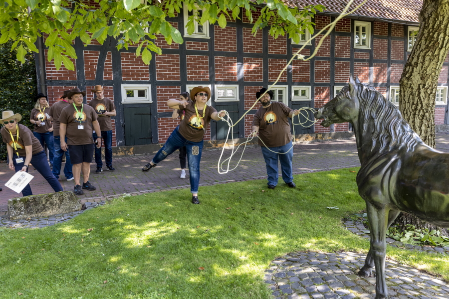 Nach dem ersten Get-Together, mit Ausgabe des diesjährigen FORT!S-Shirts und der Cowboyhüte, wurde bereits zur ausgelassenen Western-Challenge gerufen. Dazu bildeten die Helfer*innen der Agentur „Teamgeist“ zwölf Teams von je rund sechs Personen, die anschließend an sechs verschiedenen Stationen jeweils gegeneinander antraten. Die großzügige Parkanlage bot genügend Raum, um Lassowerfen, Bierkrüge schieben, Hüte fangen, Stiefelweitwurf, ein Heuballen-Schubkarrenrennen und das traditionelle Bullenreiten durchzuführen.