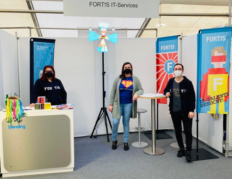 Auch die Firmenkontaktmesse bonding am 24. November war sehr gut besucht, und FORT!S konnte hervorragende Gespräche führen und vielversprechende Kontakte knüpfen. Am Messestand standen für FORT!S Denis (Software-Entwickler), Nadja (FORT!S Backoffice) und Jasmin (HR Managerin) Rede und Antwort. Bei den Gesprächen spielte auch die deutschlandweite Auszeichnung als Top Arbeitgeber mit dem 2021 erreichten Platz 5 beim Wettbewerb „Great Place To Work“ eine besondere Rolle.
